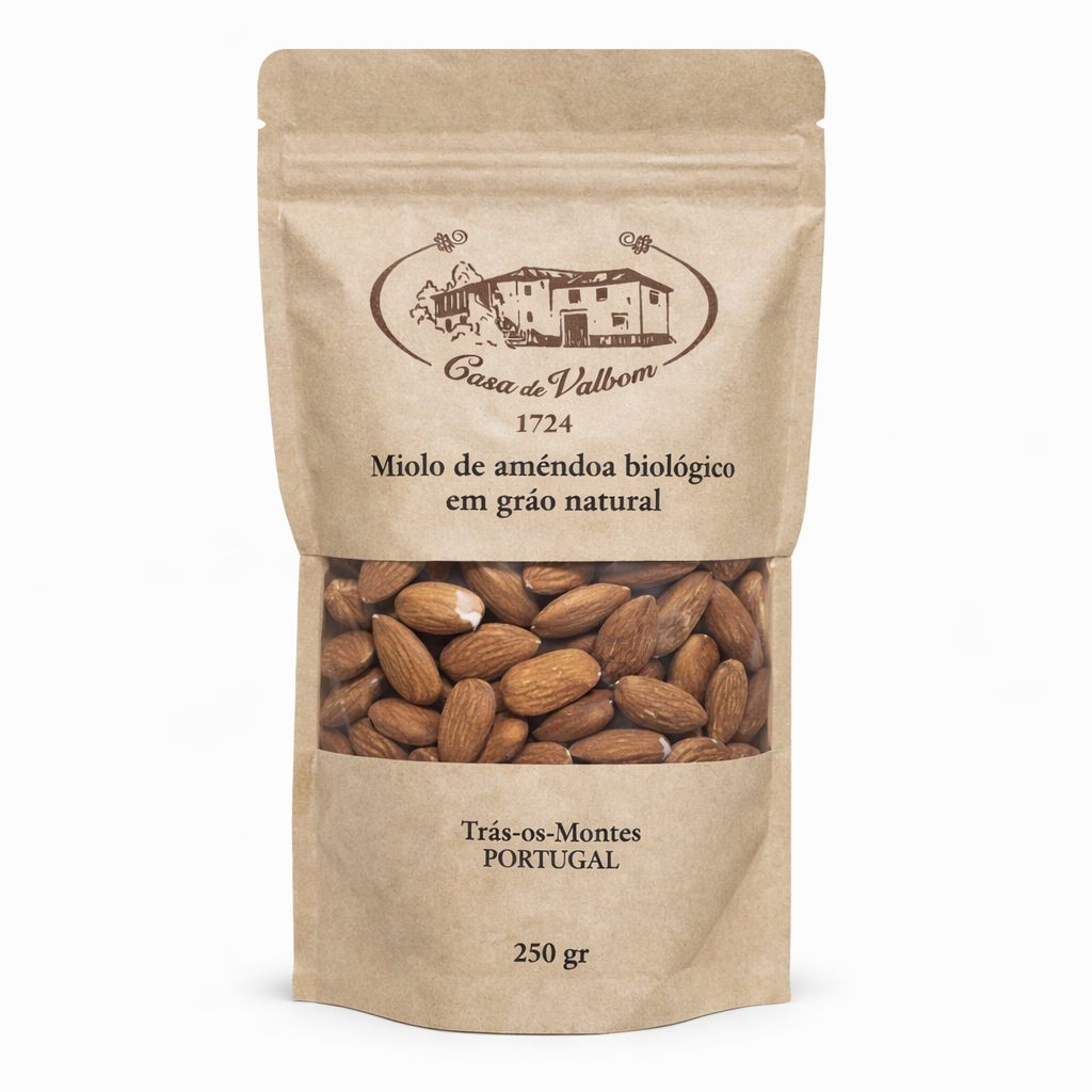 Miolo de Amendoa produzido pela Casa de Valbom dos seus amendoias de variedades francesas o que lhe confere um sabor impar aos demais.
